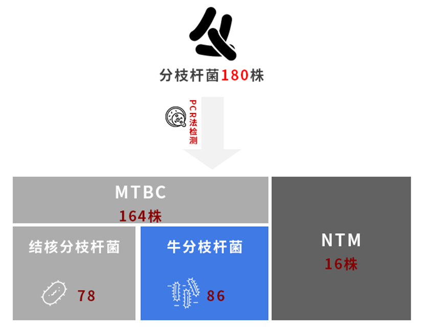 有文献研究数据表示,在上海市某医院结核患者中,对180株分枝杆菌阳性培养物进行PCR法检测,其中16株为非结核分枝杆菌,164株为结核分枝杆菌复合群。对结核分枝杆菌复合群进行特异性分析,其中78株为结核分枝杆菌,剩余86株为牛分枝杆菌。可见,牛分枝杆菌在结核患者中也有较高的比例,不容忽视。